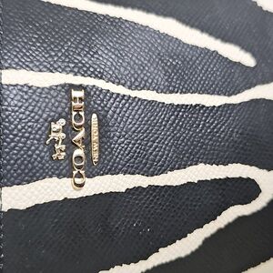 Distinctive zebra animal print leather file crossbody bag by Coach. The exterior has a large front pocket. The black ribbed interior fabric is very clean and has two small multifunction pockets. The strap is adjustable and removable. Silvertone hardware. Excellent Used Condition.