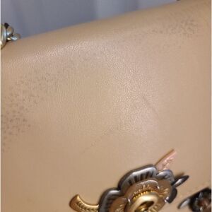 Elegant handbag with floral embellishments. Gold chain strap adds a touch of luxury. Perfect for any occasion.