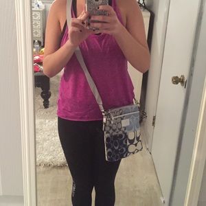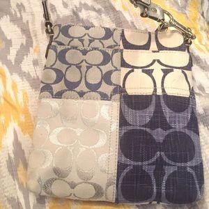 A stylish Coach body purse. It has great variety of blues on it. It is in great condition!