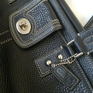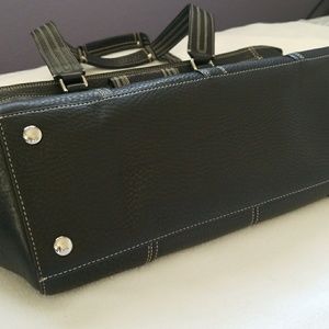 EUC. Very roomy. Clean interior and exterior. Outside has two side document pockets while inside has one zipped pocket and two small ones. All exterior white stitches are intact. No scratches or stains. No signs of wear and tear. Great fit for work or school laptop, books or notepads (no padding for laptop though). Zipper works well. Interior color looks purple-ish. Exterior leather.