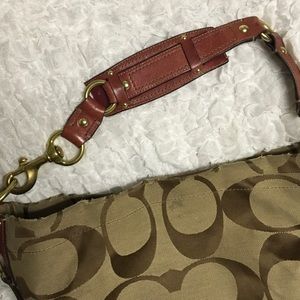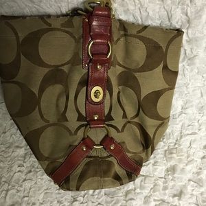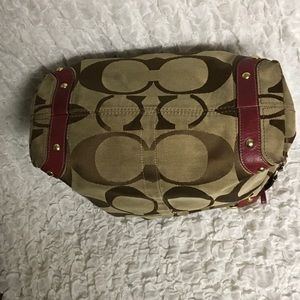 Coach shoulder bag, brown, tan with maroon leather with a hint of raspberry. Visible usage on edges. See pictures.