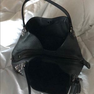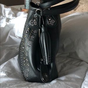 Black leather with beautiful studded detail lots of pockets. Brand new condition. Only carried for a week. I prefer a purse with one open ring. This has 3 separate compartments. Sells for $500 new.