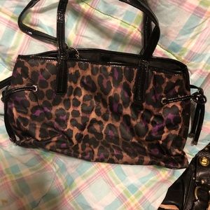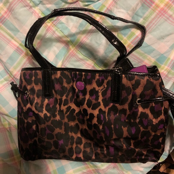 Black and purple leopard print coach bag with Patton leather handles. There is one little spot on the handle do you use it’s not perfect. Other than that the bags in really good shape