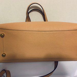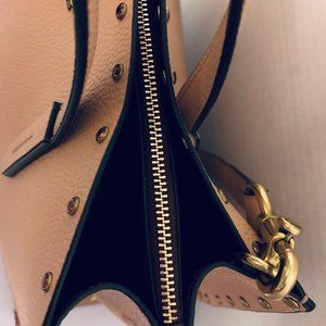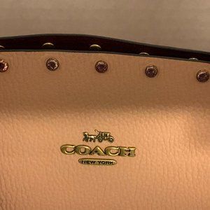 Coach Nude Pink with Rhinestones showcasing the edges of the bag. Medium in size with three compartments . Shoulder strap included. Would work well with Jeans. Size 14 D X 9.5 H X 5.75 W