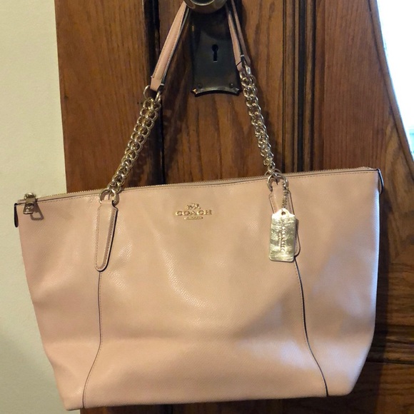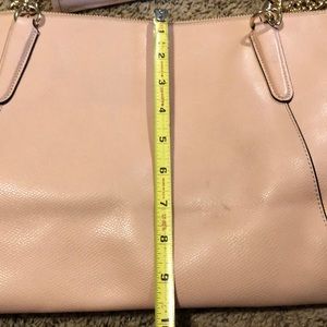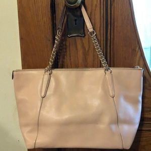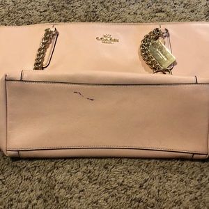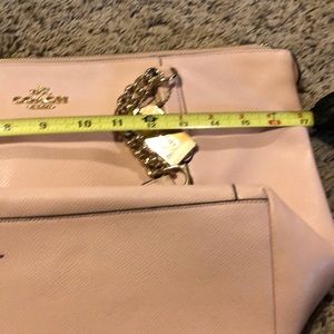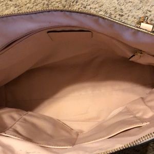 Large tote in excellent condition except for the mark on the bottom as shown in photos, inside has two open pockets and a zipper pocket, very spacious!