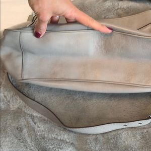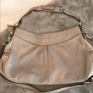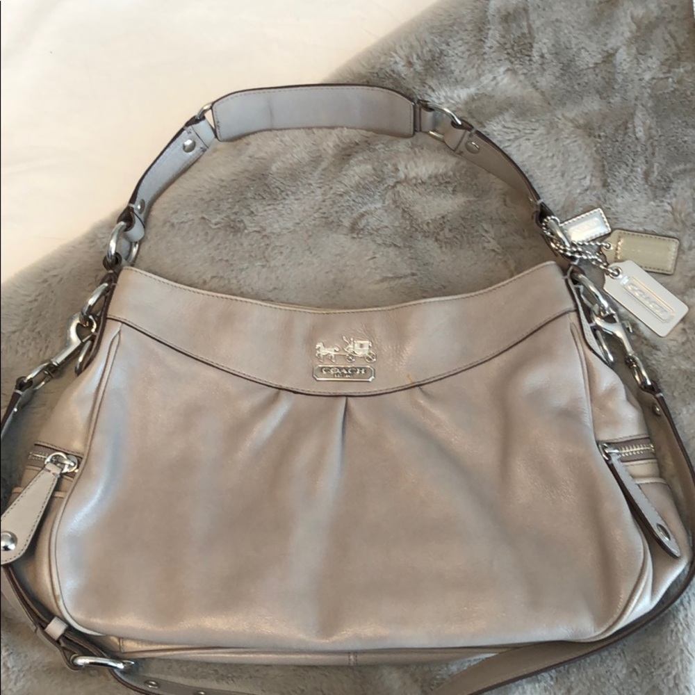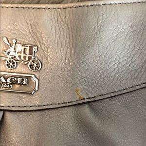 Grey Coach Madison Satchel. Removal crossbody strap. Leather is distressed. Some signs of wear on bottom of bag and some minor staining in interior. Silver hardware. Dust bag included.