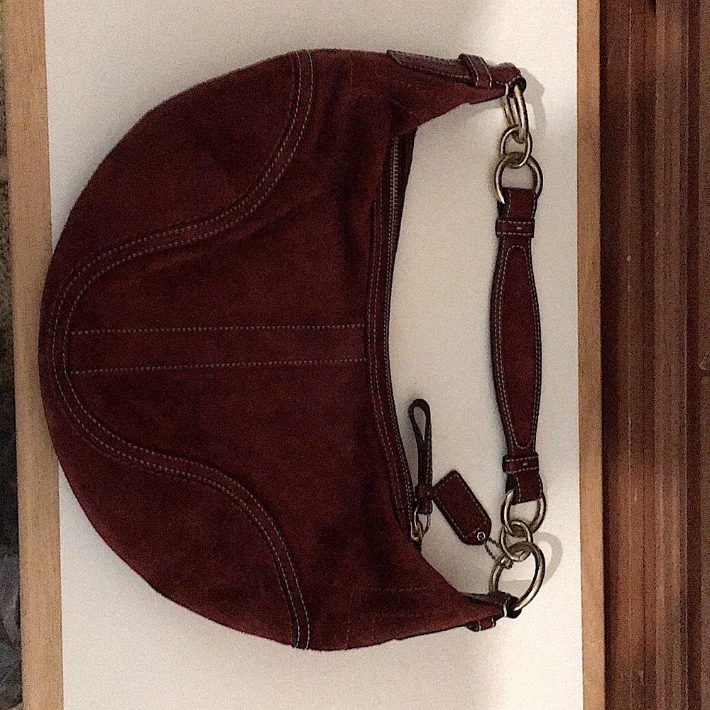 Stunning vintage suede leather COACH HANDBAG in a rich dark RED in mint condition. Honestly I don’t know why I’m selling it because I really love it but I’m doing it. To many handbags as u can see in my closet listings. Style number is hard for me to see. Sorry, but I purchased this at Dillard’s when I worked there. It is authentic. It has the buttery soft leather and real brass hardware.