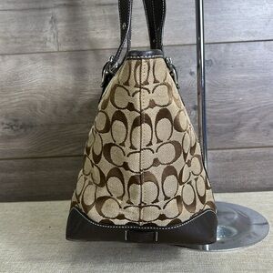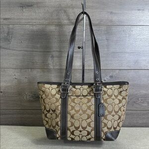 Gorgeous brown monogram canvas and leather Coach 6042 shoulder bag. 1 back slip pocket, top zippered closure, lined w/1 zip pocket, 1 cell phone pocket, 1 slip pocket. Has light stains as pictured.