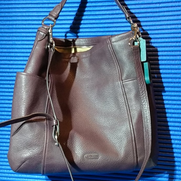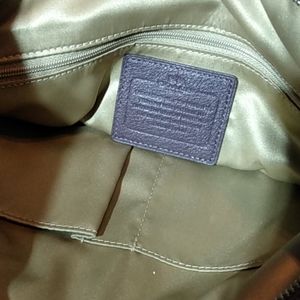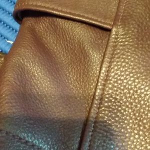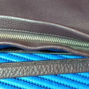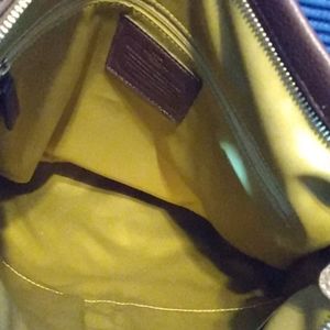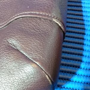 Deep brown burgendy color see wear masks on bottom inside tan very clean no issues see pictures no issues with straps detachable shoulder strap very nice