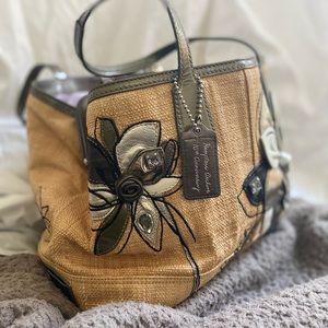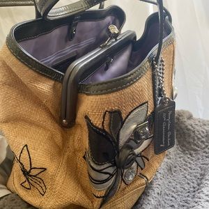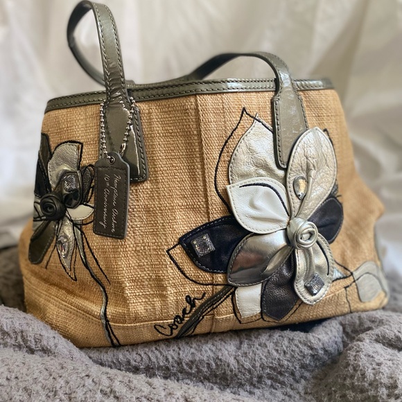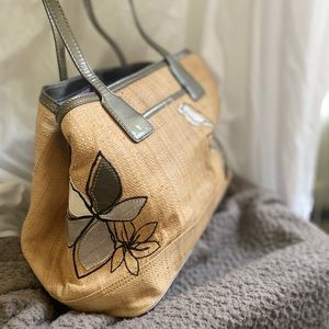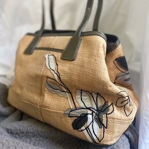 Straw bag with raised leather flowers