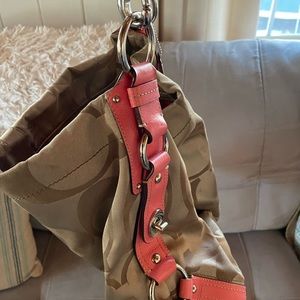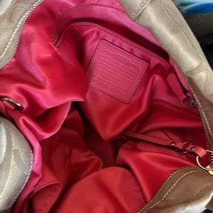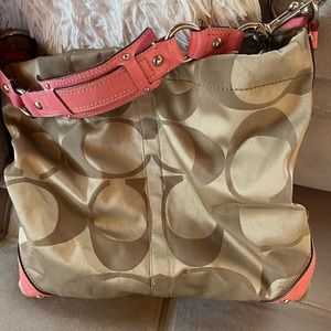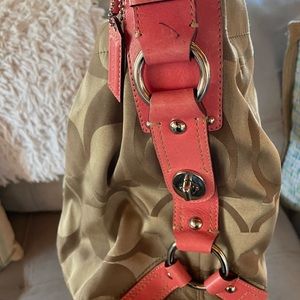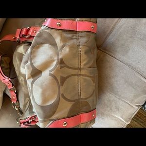 Coach bag with roomy interior and plenty of pockets. Pink straps. Normal wear.