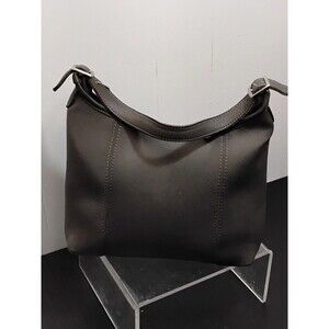 This Coach 6219 Vintage Neoprene Bag in Gray is a medium-sized crossbody bag with a solid pattern, featuring a zip closure and silver hardware. The exterior is made of neoprene material, giving it a modern yet vintage look. The bag has a unique design with a 9-inch height, 8-inch width, and 3-inch depth. It has a black neoprene lining, faux leather gray handles/straps, and is made in the United States as part of the Coach product line. Perfect for women who appreciate designer accessories with a touch of retro charm.