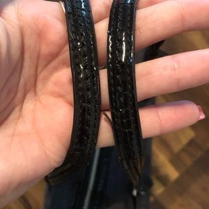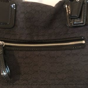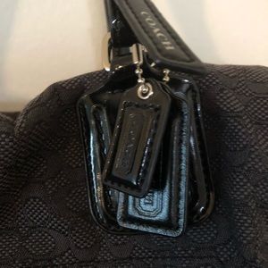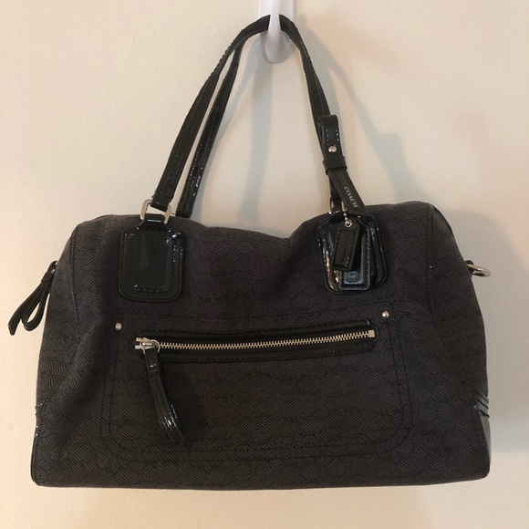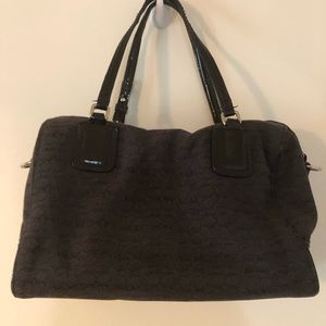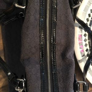 Black Coach C print mini duffel purse. Is missing its long strap. The straps and around the zipper have some cracks in the leather (see photo).