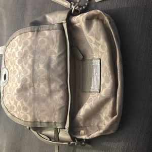 Small shoulder bag ,gray,zipper on inside, two pockets inside pocket outside on back of purse with zipper .Latches on front of bag,little faded under the latch.Good used condition.