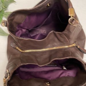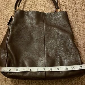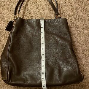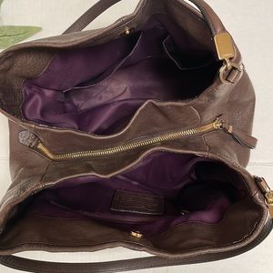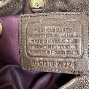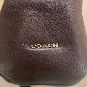 Coach - vintage Coach purse. Minor signs of wear on front and back but gives it the nice leather look. Snap closure. 3 separate compartments. One with zipper in middle. Lovely dark brown leather!