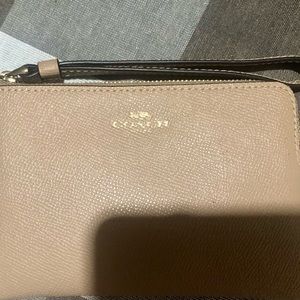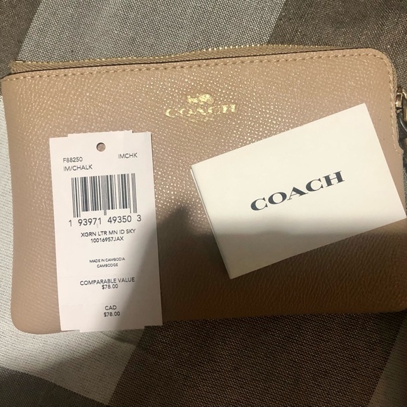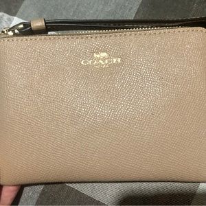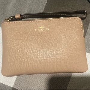 COACH CORNER ZIP WRISTLET IM/TAUPE, THIS CROSSGRAIN LEATHER CORNER ZIP WRISTLET IS PERFECTLY SIZED WITH TWO CREDIT CARD SLOTS, ZIP TOP CLOSURE, FABRIC LINING AND WRIST STRAP ATTACHED. 6 1/4"(L) x 4" (H) x 1/2" (W)