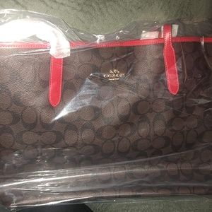 Coach City Tote Signature Canvas with Varsity Motif Smooth Leather Inside zip pocket, Snap closure Handles with 10" drop Approximate Measurements: 13" (L) x 11 1/2" (H) x 6 1/4" (W)