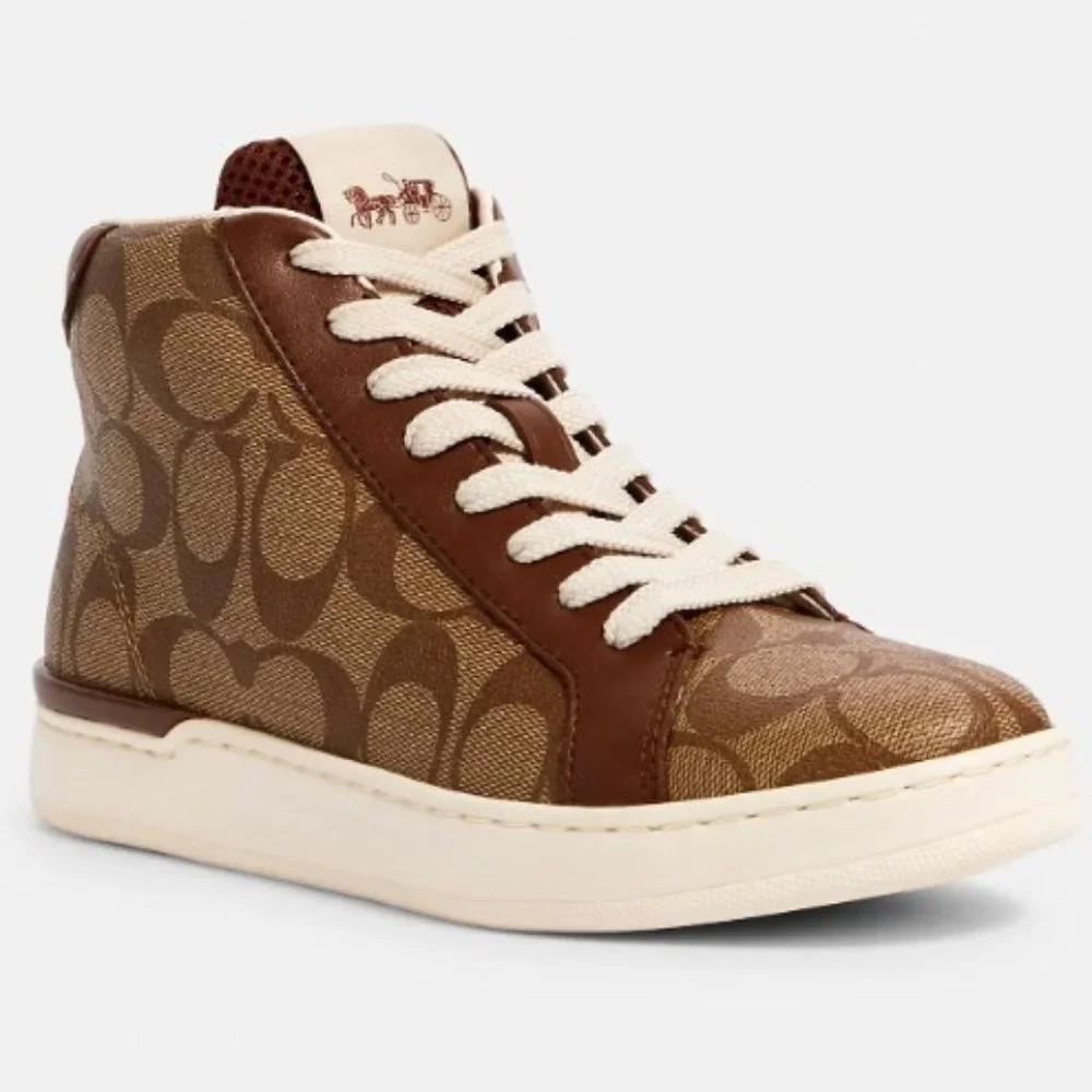 Clip High Top Sneaker. Signature coated canvas, leather and fabric upper. Have original box, worn once, realized size was too big and was too late for return. I wear a 6.5, bought a 7 thinking wear thick socks, still big. Lesson learned I wear 5.5 in Coach sneakers. (Normal size in shoes 6.5)