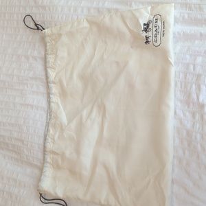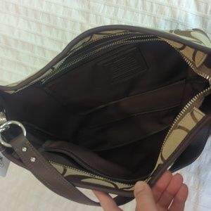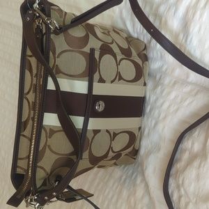 Coach shoulder bag with original coach logo (brown on brown), and dark brown/ khaki racing stripe. Silver colored hardware, short shoulder strap, and removable, adjustable, longer crossbody strap. One large inner pocket with zip top closure, inside two smaller side pockets, one with zipper, please see pictures. Approximate dimensions: 14" long by 10" high by 4" wide (at base). short shoulder strap approximately 5" high, longer crossbody strap approximately 19" high at middle setting