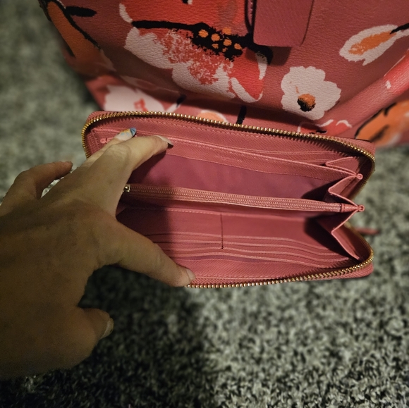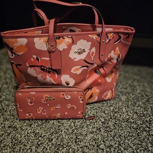 Pink flowered coach purse with matching wallet no flaws. Hand held approximately 9 to 10 inches long. price firm