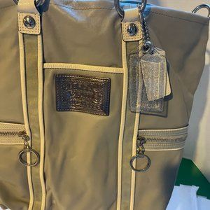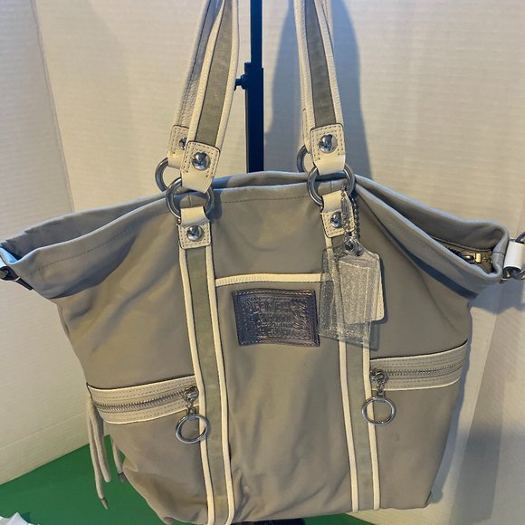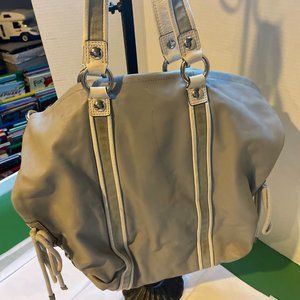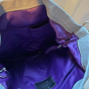 Light Gray leather Coach bag with white straps. Bag had a purple fabric liner. In great condition no scratches or rips, lightly used .