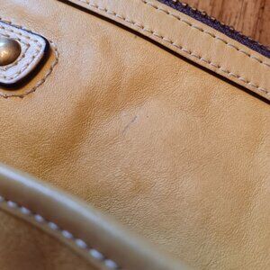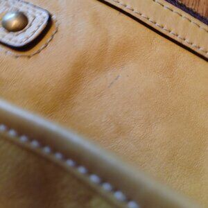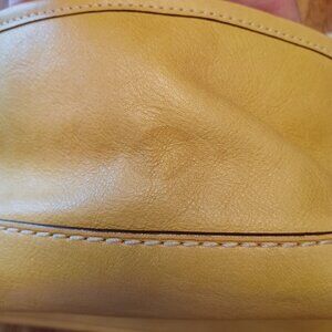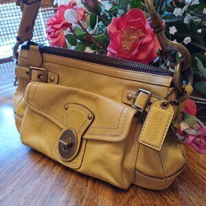 Price firm. Authentic Coach handbag. Yellow leather. Chunky hardware. Colorful striped satin interior. Some spots and pen marks, as shown in the pictures. Gentle signs of mild wear (i.e., pulled, frayed threading, hardware scratching).