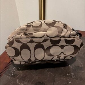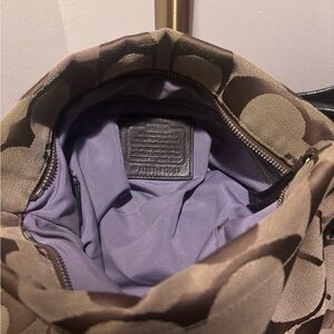 Brown signature cloth hobo, top brown leather handle, top zipper closure, one hangtag, back zipper pocket, silver hardware, rayon lilac cloth interior, two slots, one zipper pocket, normal wear