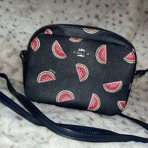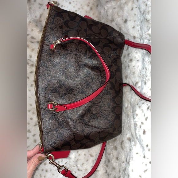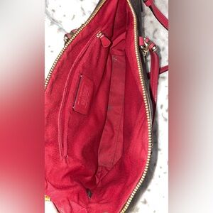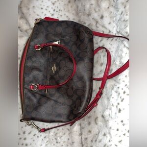 Brown and red coach bag, includes a cross body strap. Used. Photos include front,back,inside & logo.