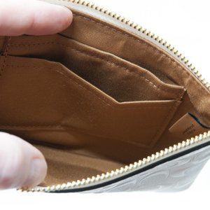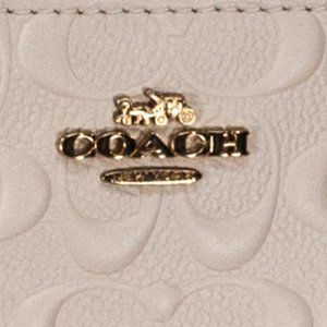 Classic Coach wristlet in signature embossed creamy white leather. Zipper rounds one corner. Contrasting black edge dressing on the leather. Coach emblem in gold-colored brass on one side. Pockets for two credit cards. Fabric lined. Attached wrist strap.
