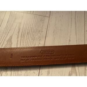 Classic Coach Men’s Leather Belt in size 38 (95 cm). Handcrafted in Costa Rica from polished cowhide leather with a solid brass buckle. The belt features a black exterior with a tan leather interior, single keeper loop, and Coach embossed logo inside.