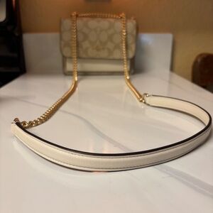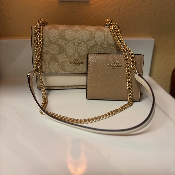 This is a adjustable coach, Crossbody option! And a shoulder bag with a matching wallet. It’s a beautiful beige tan with the traditional coachprint on it.
