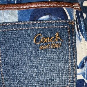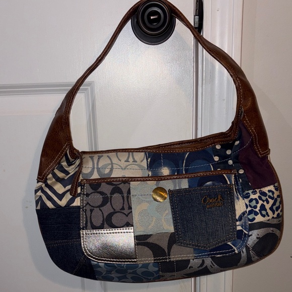 Chic Coach hobo bag with a patchwork design. Features blue and brown tones. Ideal for everyday style.