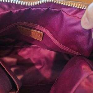 Never used. It is brown and has the shoulder strap wrapped around the bottom of the handbag