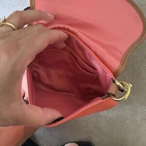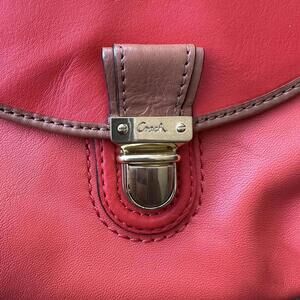 579. Mini leather coach bag with gold hardware and two toned leather. In excellent condition