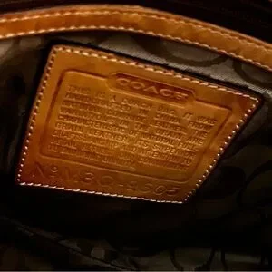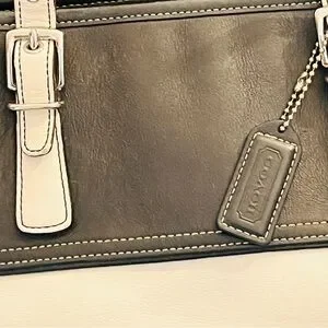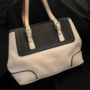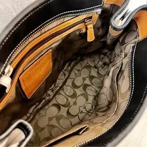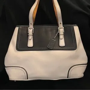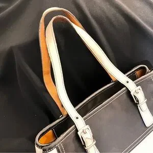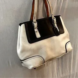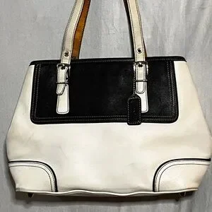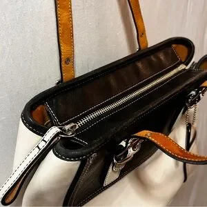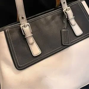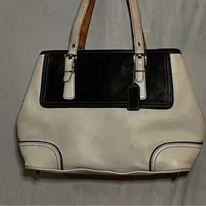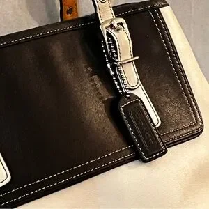 Chic Coach tote in black and cream. Features tan accents. Ideal for everyday use.