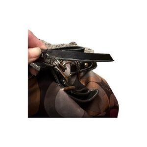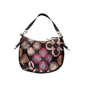 Brown colored Coach Madison graphic OP art sateen shoulder bag with signature print.features black lining with tan signature print.Vintage from the early 2000s.The zipper is a little worn and so is the strap and the bag needs cleaned from storage there are no rips or stains