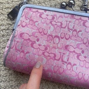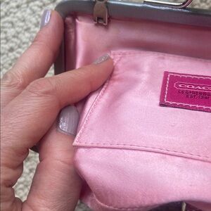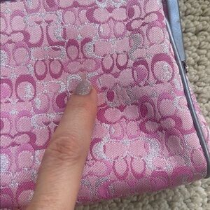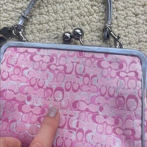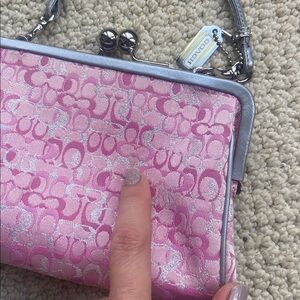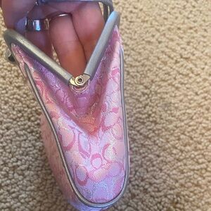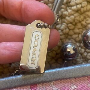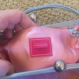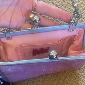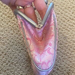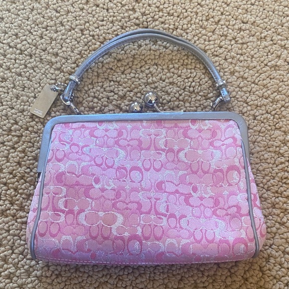 Rare vintage collectible small Coach bag with signature pink pattern. Limited edition pink optic lurex kiss lock with silver leather piping. As can be seen with the pictures EUC but it’s vintage so there are little stains but very hard to see. I have tried to picture them in last 5 pics but very very hard to see. Sold recently on Depop in a terrible condition for $465. This is a great deal and a Final sale