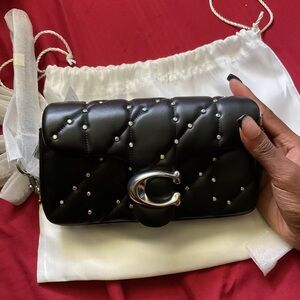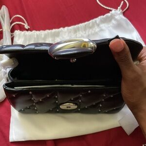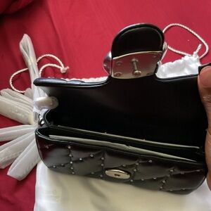Chic black quilted clutch. Features silver-tone hardware and elegant design. Ideal for stylish outings.