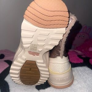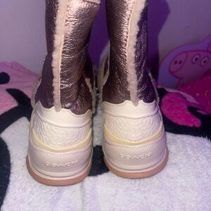 Stylish metallic boots with cozy fur trim. Perfect for a chic look.