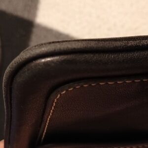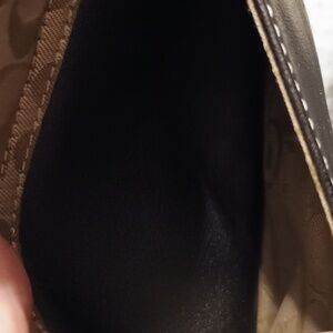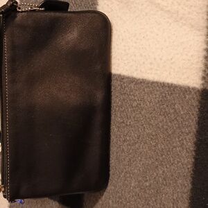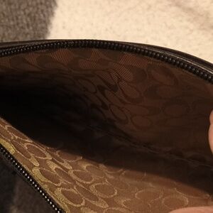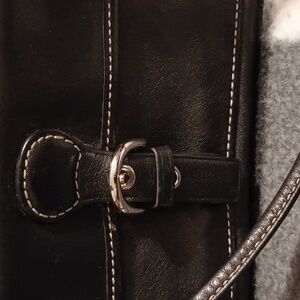 This stylish COACH Bleecker wristlet is the perfect accessory for any occasion. With a black leather exterior and silver hardware accents, this small purse exudes a vintage vibe. The top handle is made of black leather and features a buckle accent, while the fabric-lined interior includes a small outside front pocket for added storage. Measuring 7.5" in width, 4.5" in height, and .5" in depth, this wristlet is small but practical. With a zipper closure and a 6" strap drop, it is easy to carry and ideal for everyday use. The satin fabric type and brown lining color add a touch of luxury to this classic design.