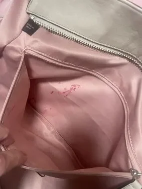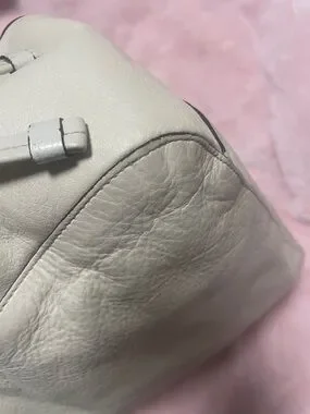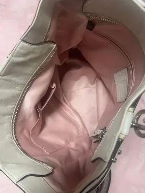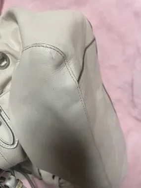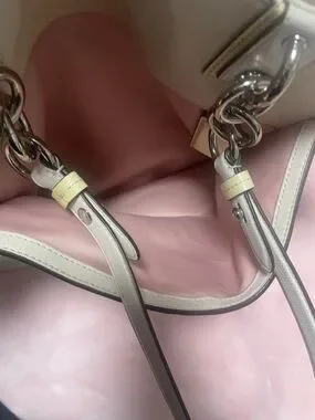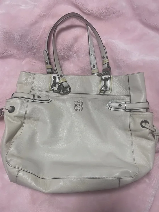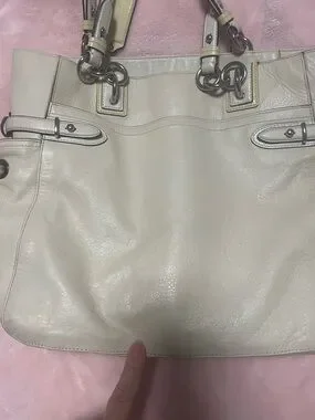 Coach tote cream colored no major callouts corners are good no major rubs handles are great inside pocket has lipstick stains inside. The rest of the bag is clean. Handles are clean. Hang tag is good. Some glue spots that coaches are famous for.