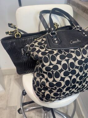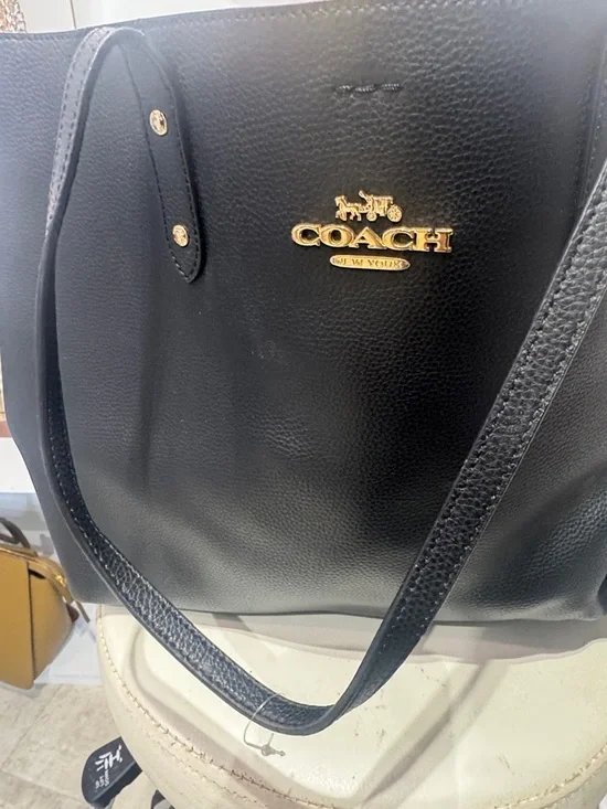 Classic Coach tote in black pebbled leather. Gold-tone logo plaque adds shine. Comfortable shoulder straps. Sleek, versatile silhouette for everyday use.