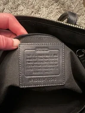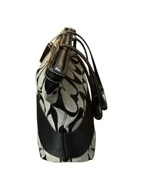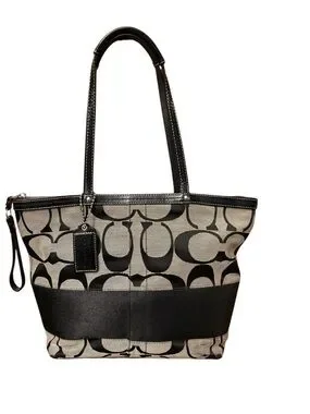 Gray coach bag with black signature print and leather trim and handles.Good condition.Theres a small black mark in right corner of bag.length is 13 inches and height is 9.5 inches vintage (early 2000)