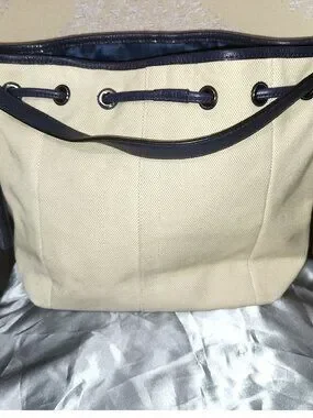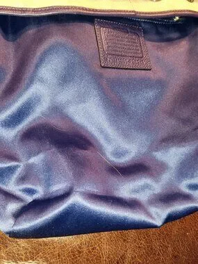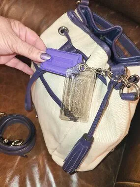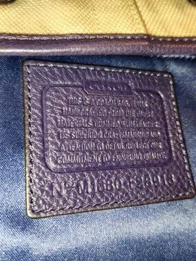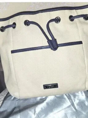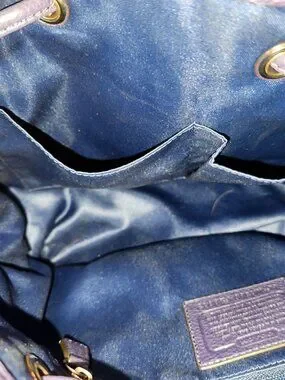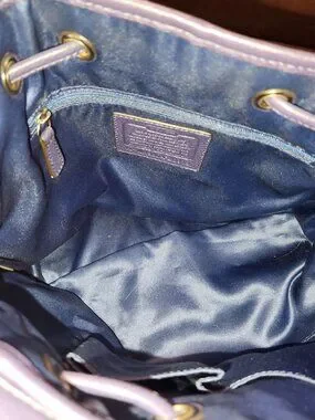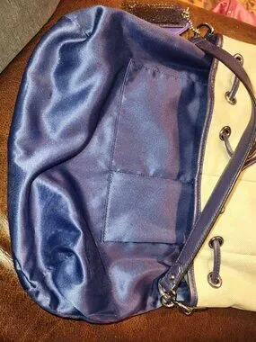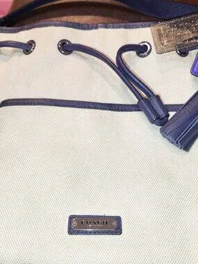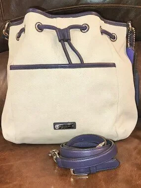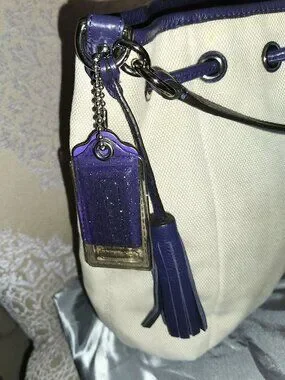 Genuine Coach bucket style bag. Exterior is cream canvas with purple leather trim/handles/tassel with magnetic close pocket and cinch style closure.