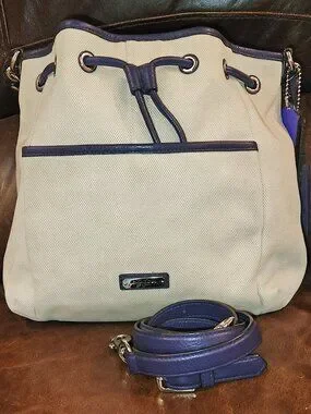 This Coach Avery Canvas Drawstring Shoulder Bag, style F28913, features a canvas body with purple leather trim and an adjustable crossbody strap.