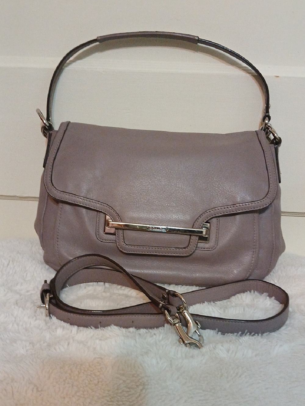 -Silver-toned hardware & front bar w/Coach logo