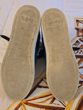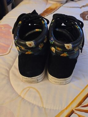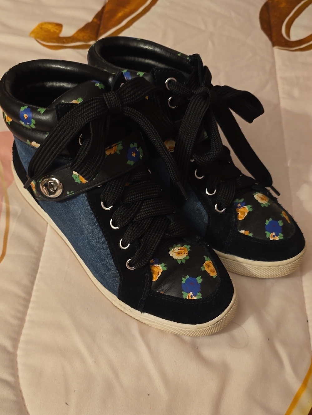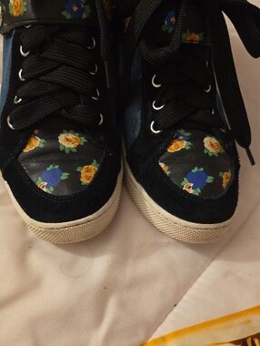 Coach ankle high floral and leather and blue Jean tennis shoes size 8 good condition some wear on bottoms
