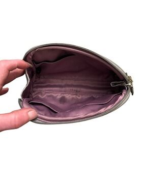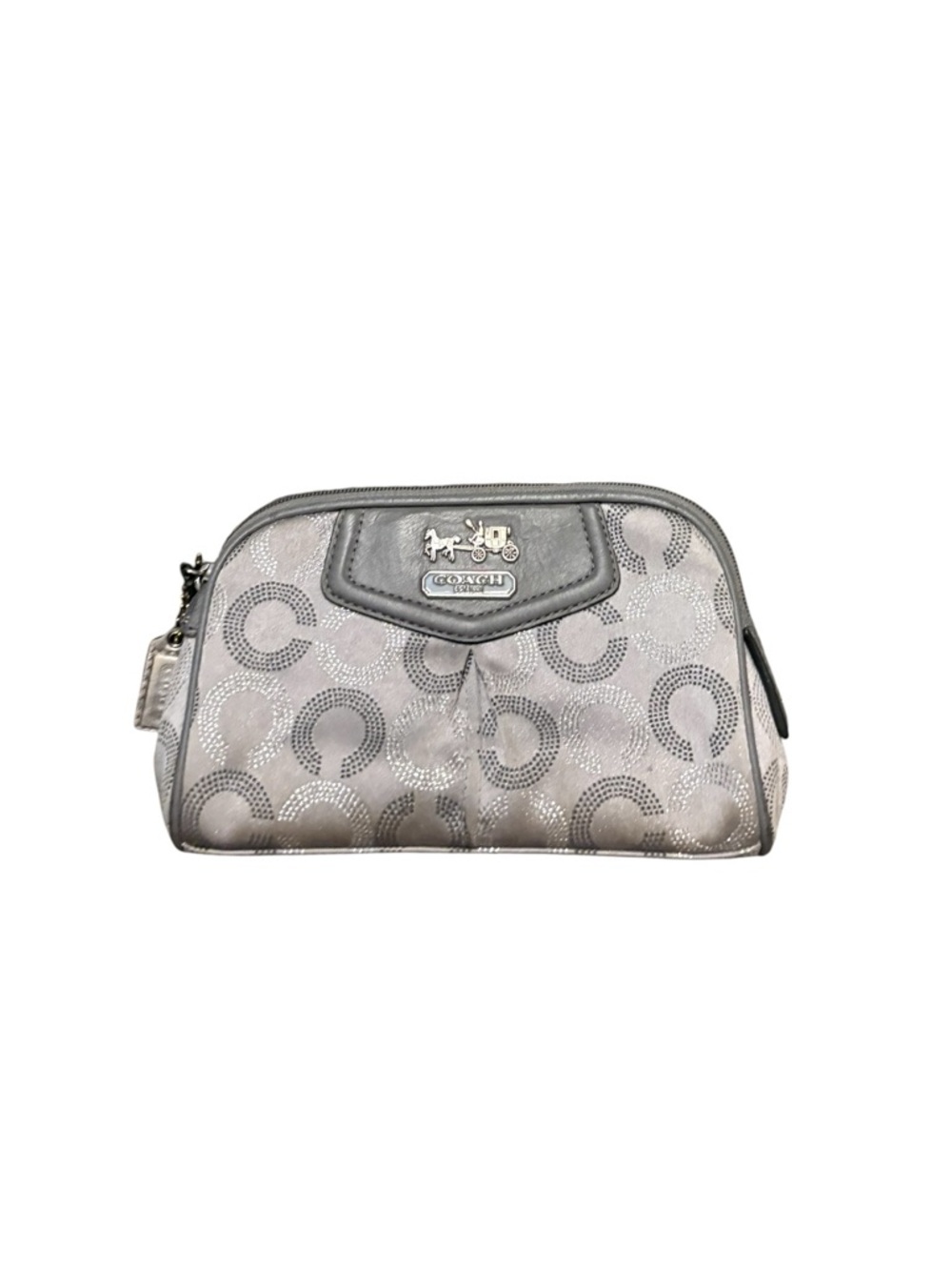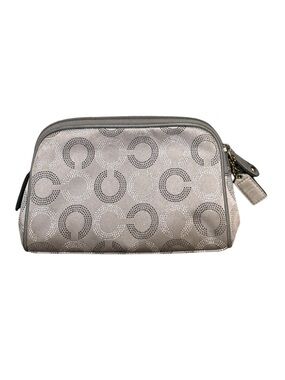 Silver/gray Coach cosmetic bag with signature print and purple lining.There is a spot on the lining the outside has no callouts