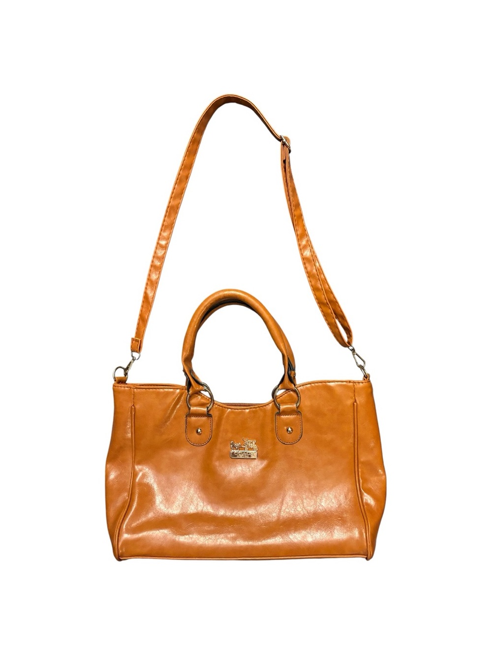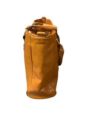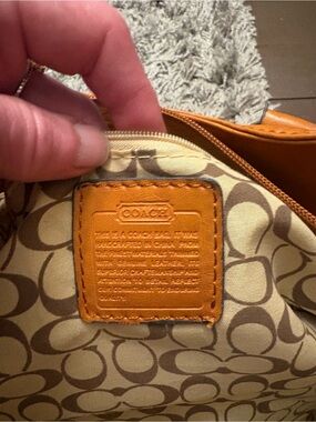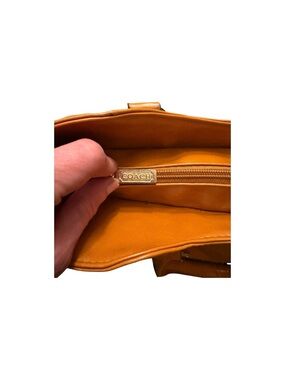 Tan,leather Coach bag with beige lining with signature print.Gold plated hardware.Comes with removable adjustable strap great condition length is 16.5 inches and height is 13 inches