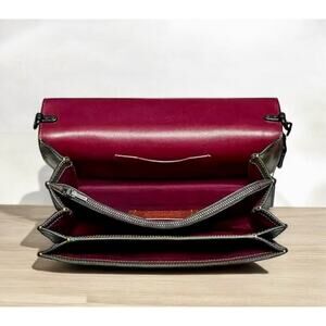 Interior Detail – Refined burgundy calf leather and canvas with four internal compartments with accordion expansion sides and bottom. One section has a card holder and one section has a zippered closure.